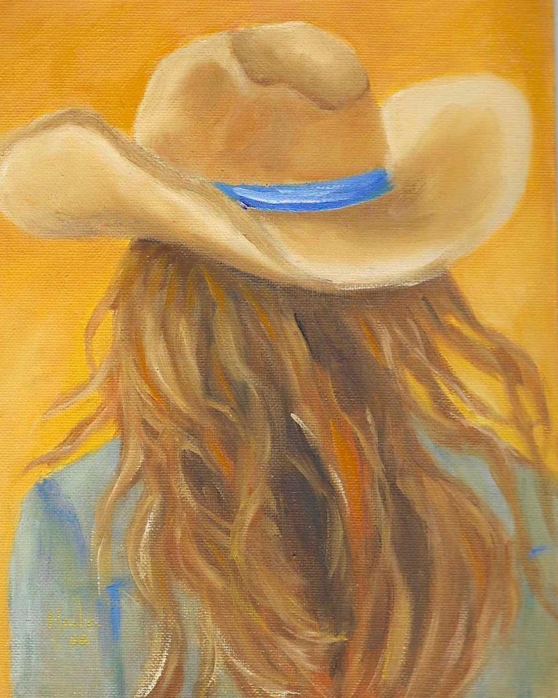 This painting invites you to peek from behind a mysterious figure sporting a wide, sandy cowboy hat with a cool blue band. Their long, wavy hair tumbles down in rich shades of brown and auburn, catching your eye with its soft, flowing movement. Set against a bold orange backdrop, the warm colors dance together like a sunset moment frozen in time. It’s a cozy, charming glimpse that feels like a sunny secret waiting to be discovered.